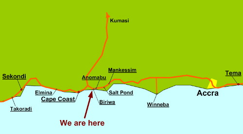 Sie finden uns auf der Strecke von Accra nach Cape Coast, kurz hinter Anomabo.