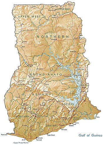 Der Küstenstreifen von Accra ist von erstaunlichen Kontrasten gezeichnet. Im Westen findet man sandige Dünen etwa zwei bis drei Kilometer westlich geht der Sandstrand in Felsen über. Entlang der Küste von Accra in Richtung Cote d' Ivoire wechseln sich Sand und Steine ab. Nach Osten ist das Land von Süß und Salzwasser ( Brackwasser ) gezeichnet, es gibt folglich viele Lagunen und diese werden wiederum von den Armen des Volta gespeist. Die Küste hier ist tiefer als der Meeresspiegel und der einzige Schutz sind Sanddünen. Das Resultat ist dass die Dörfer und Städte entlang dieser Küste immer Häuser und Felder an die See verlieren. Im Westen des Landes ist die Küste steiler und wird von Felsen geschützt. Der Schwarze Volta ist die natürliche Grenze zwischen Ghana und Burkina Faso und dieser fließt ins Meer an der Mündung des Tano Flusses. Der weiße Volta fließt schräg durch das Land und in den roten Volta welcher in Ada ins Meer fließt. An einem Punkt kommen alle drei Volta Flüsse zusammen und dies ergibt den Volta Fluss. Der Akosombo Hydroelectric Damm erstreckt sich über den Volta und hat damit den größten künstlichen See der Welt kreiert - den Volta See - 8600 qkm. Der Akosombo Damm produziert Elektrizität für Ghana und ihre Nachbarn Cote d'Ivoir, Burkina Faso und Togo. Der Tano Fluss ist die natürliche Grenze zwischen Cote d'Ivoire und Ghana. Der Ankobra Fluss teilt sich in zwei bevor er im Westen ins Meer fließt. Der Pra Fluß reicht vom Kwahu Plateau im Osten bis Sekondi im Westen wo er dann im Meer endet. Weiter im Osten gibt es zwei Flüsse den Ayensu und den Nensu - der Densu versorgt Accra mit Wasser. Die Wälder in Ghana sind trotz vielem Abholzen an vielen Stellen immer noch sehr dicht bewachsen. Es ist eine wunderbare Welt voller Tiere und Pflanzen, viele davon vom Aussterben bedroht. Man könnte den selben Ort zwanzig mal besuchen und immer noch neue Entdeckungen machen. Der Wald der auf das Cambrian Plateau trifft, teilt sich in zwei. Im Südwesten ist der tropische Regenwald mit Riesenbäumen verschlungen mit Lianen und Millionen von parasitischen Pflanzen. Weiter im Osten wo man auf den Volta See stößt ist der Wald weniger dicht und viele der Bäume verlieren ihre Blätter während der Trockenzeit. In dieser Gegend wird der Wald mehr gelichtet durch die Holzindustrie und die Anlage von Kakao Plantagen. Da dieses Gebiet auch relativ dicht besiedelt ist wird viel Wald abgebrannt um Farmen mit Gemuese, Cassava und Mais anzulegen. Der Rest des Landes ist zum Grossteil Savanne mit Ausnahme die Gegend um den Volta See, der Küste und der Gegend zwischen dem Volta See und der Grenze zu Togo. Die Weite der